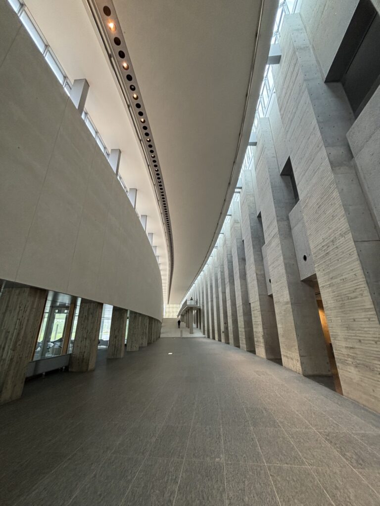 昨年5月の終わりに訪れた岩手県立美術館は、盛岡中央公園に隣接しており館内からは豊かな緑が窓越しに望める美しい空間でした。自然光がやわらかく差し込むように設計されていて屋外の風景と室内がゆるやかにつながることで、より開放的な雰囲気が生まれています。このような空間では、ただ佇むだけで時間がゆったりと流れ心が落ち着き、芸術鑑賞以上の豊かさを感じることができます。